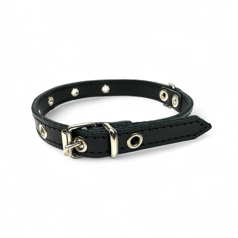 Fleksas natūralios odos antkaklis šuniui su metaliniu pusžiedžiu pavadėliui prisegti ir metalinėmis akutėmis per visą ilgį, skirtomis antkaklio dydžiui reguliuoti.