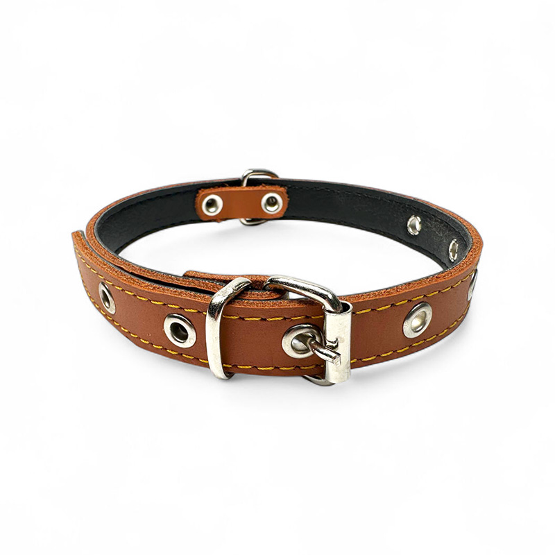 Fleksas natūralios odos antkaklis šuniui su metaliniu pusžiedžiu pavadėliui prisegti ir metalinėmis akutėmis per visą ilgį, skirtomis antkaklio dydžiui reguliuoti.