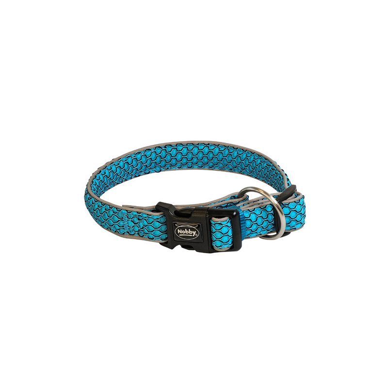 Nobby mėlynas antkaklis šuniui, pagamintas iš tinklinio audinio ir su ryškiomis atšvaito juostelėmis.