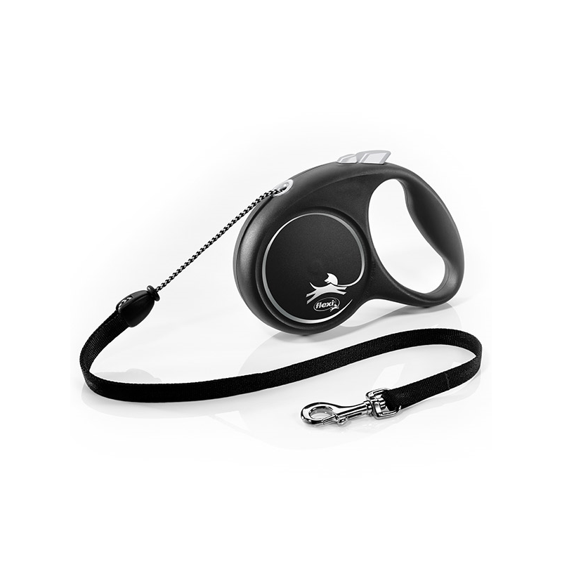 Flexi pavadėlis šunims, klasikinės juodos spalvos ir su ryškiais spalvų akcentais. Virvinis pavadėlis puikiai tinka šunims, sveriantiems iki 20 kg.