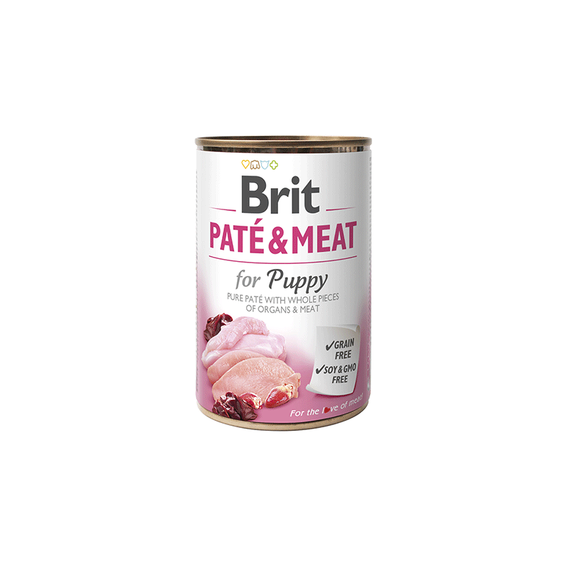 Brit Care Chicken & Turkey Pate & Meat for Puppy – gardus paštetas šuniukams su 70 % vištienos ir kalakutienos mėsos.