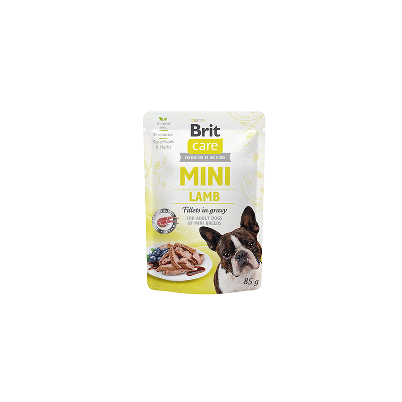 Brit Care Mini konservai šunims su ėriena, padedantys pagerinti išrankių šunų mitybą. Gardūs ėrienos filė gabalėliai švelniame padaže, subalansuoti mažų veislių, suaugusiems šunims.
