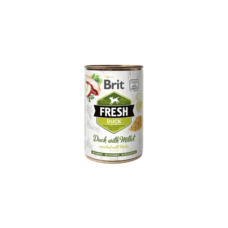 Brit Fresh Duck & Millet – šunų konservai su antiena ir sorų kruopomis, gausūs vertingų maistinių medžiagų.