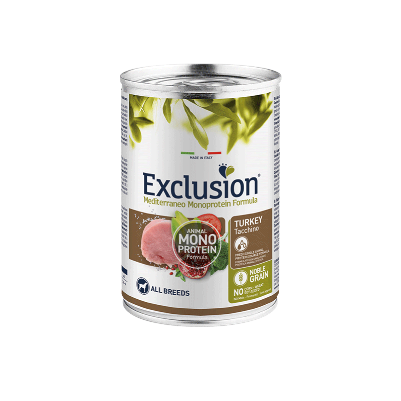 Exclusion konservai šunims su kalakutiena, subalansuoti suaugusiems, visų veislių šunims. Konservai papildyti išskirtiniais Viduržemio jūros regiono supermaisto ingredientais, kurie suteikia vertingų maistinių medžiagų.