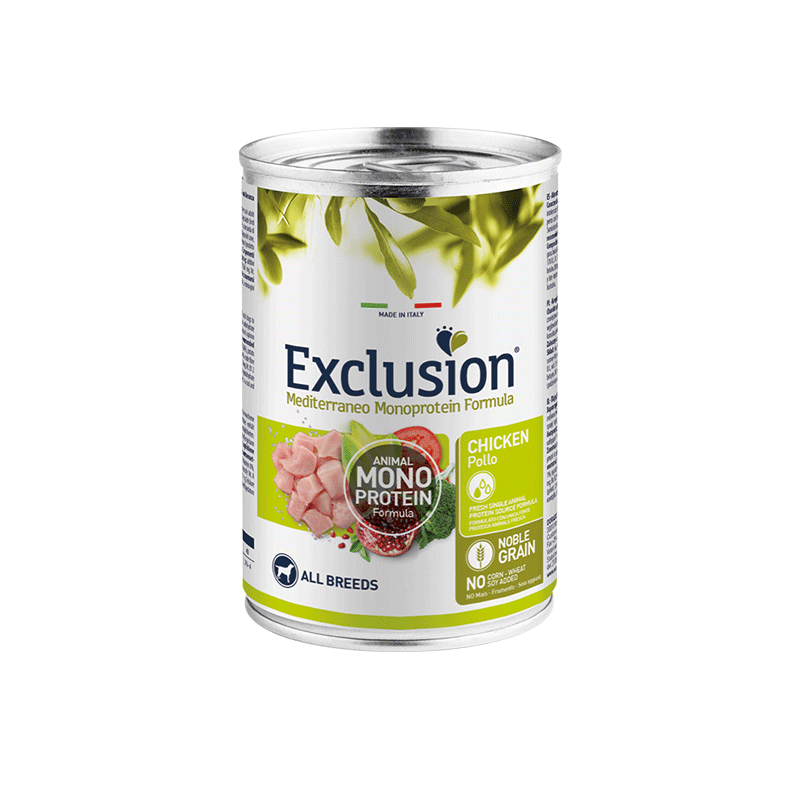 Exclusion konservai šunims su vištiena, subalansuoti suaugusiems, visų veislių šunims. Konservai papildyti išskirtiniais Viduržemio jūros regiono supermaisto ingredientais, kurie suteikia vertingų maistinių medžiagų.