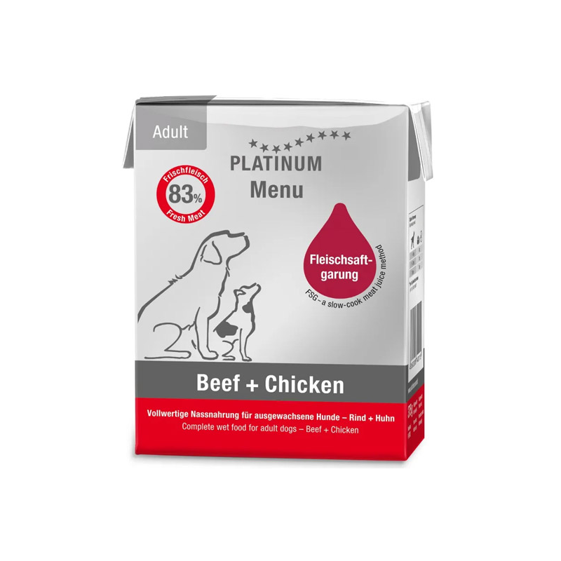 Platinum Menu konservai šunims su jautiena ir vištiena mėsa. Sudėtyje net 83 % šviežios mėsos ir gausu natūraliai gautos drėgmės.