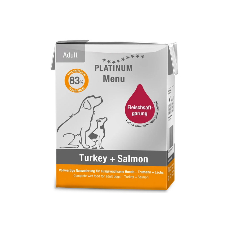 Platinum Menu konservai šunims su kalakutiena ir lašišų mėsa. Sudėtyje net 83 % šviežios mėsos ir gausu natūraliai gautos drėgmės.