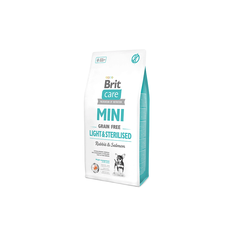 Brit Care Mini Light & Sterilised – hipoalerginis šunų maistas su triušiena ir lašiša, subalansuotas mažų veislių, nutukusiems šunims.
