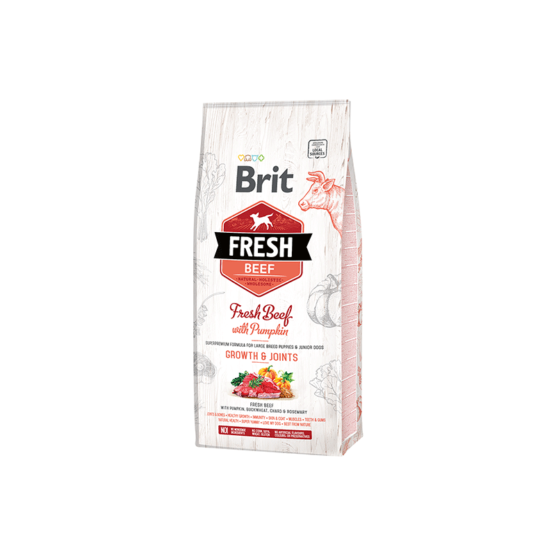 Brit Fresh Beef with Pumpkin Puppy Large – sausas maistas šunims, pagamintas iš 40 % kruopščiai perdirbtos, šviežios jautienos mėsos.