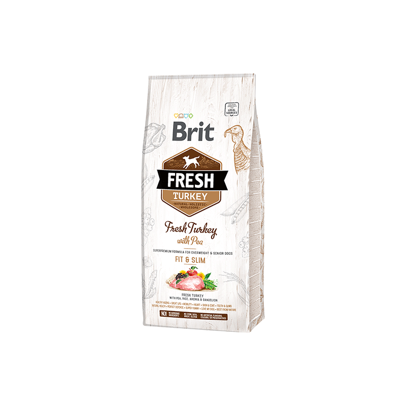 Brit Fresh Turkey with Pea Light Fit & Slim – sausas maistas šunims, pagamintas iš 40 % kruopščiai perdirbtos, šviežios kalakutienos mėsos.
