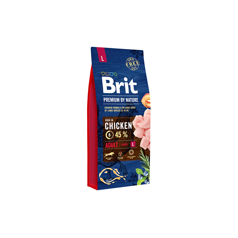 Brit šunų maistas su vištiena, subalansuotas didelių veislių, suaugusiems šunims. Visavertis sausas maistas, padedantis palaikyti blizgantį kailį, sveiką odą ir stiprią širdį.