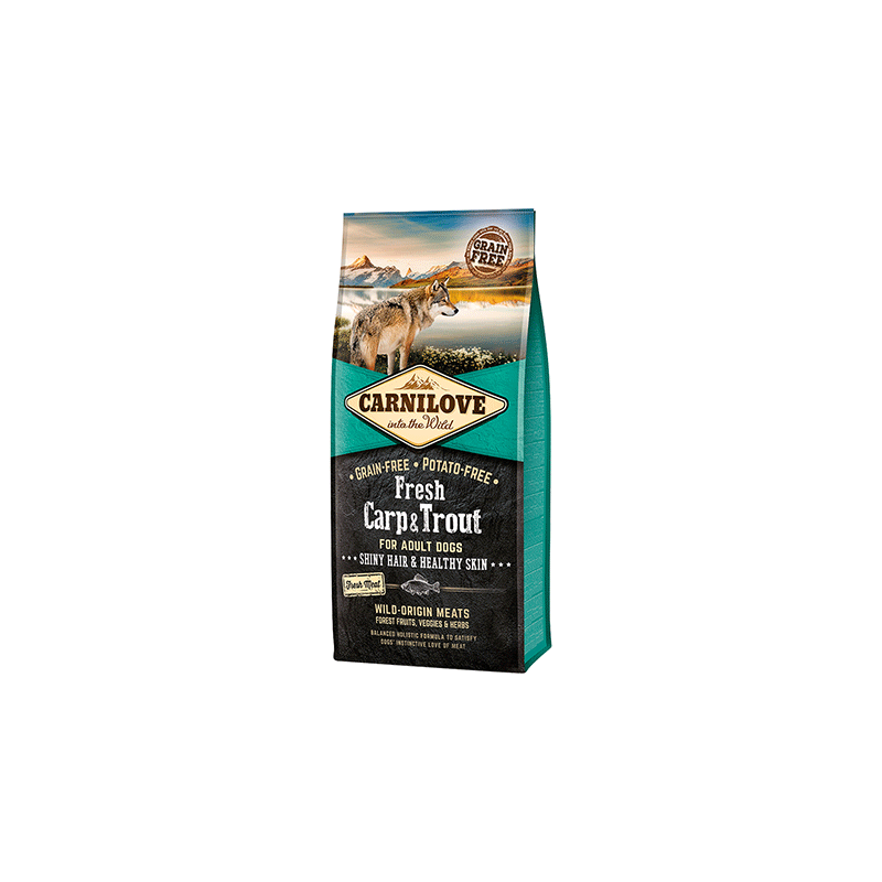 Carnilove Fresh begrūdis šunų maistas su šviežiu karpiu ir upėtakiu suaugusiems šunims. Pagamintas iš laukinės žuvies ir miško vaisių, daržovių, laukinių uogų ir žolelių, suteikiančių natūralių vitaminų, antioksidantų ir maistinių medžiagų.