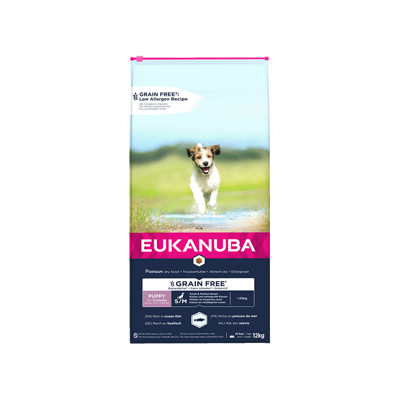 Eukanuba Grain Free Puppy S/M – premium šuniukų maistas su žuvimi.