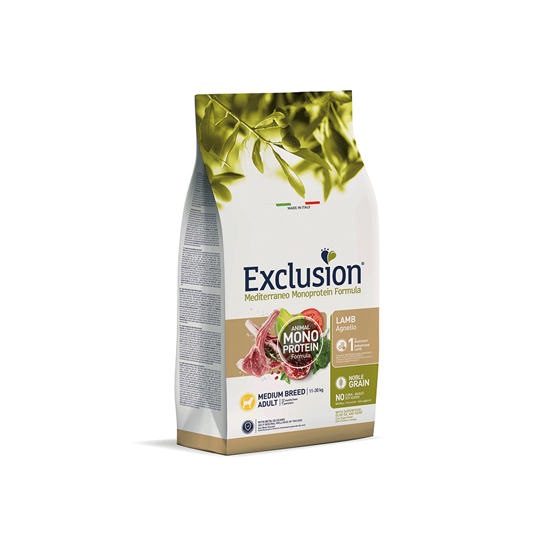 Exclusion sausas šunų maistas su gardžia ėriena. Subalansuotas suaugusiems, vidutinio dydžio veislių šunims ir papildytas išskirtiniais Viduržemio jūros regiono supermaisto ingredientais.
