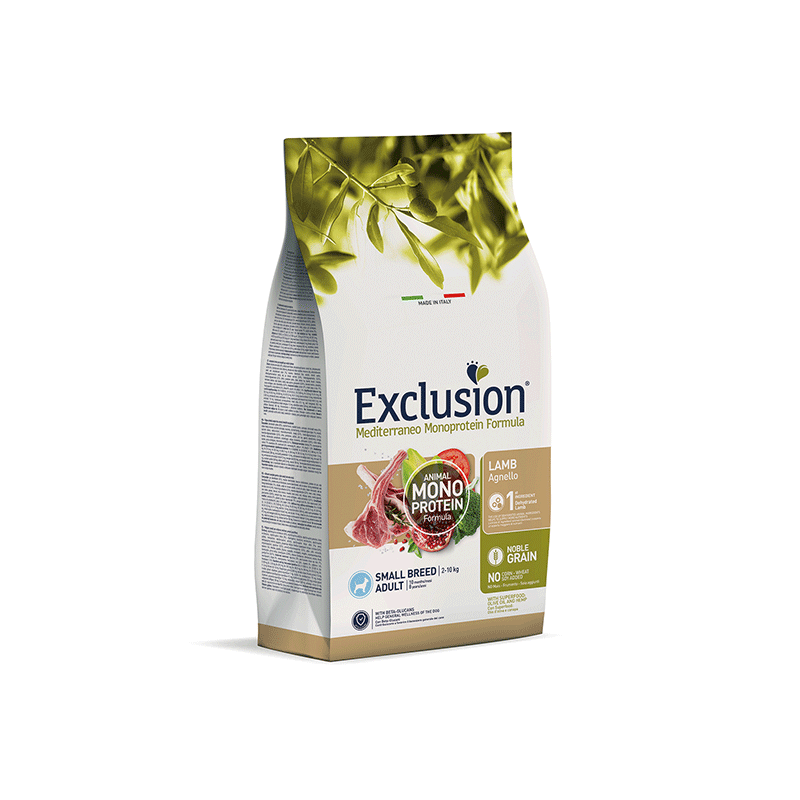 Exclusion sausas šunų maistas su gardžia ėriena. Subalansuotas suaugusiems, mažų veislių šunims ir papildytas išskirtiniais Viduržemio jūros regiono supermaisto ingredientais.