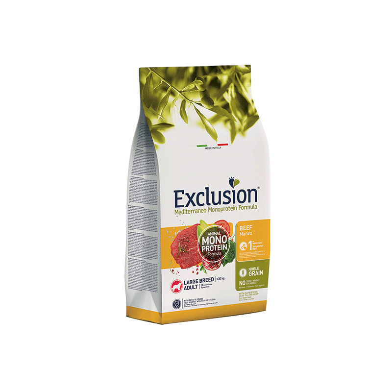 Exclusion šunų maistas su jautiena, subalansuotas suaugusiems, didelių veislių šunims. Sausas maistas papildytas išskirtiniais Viduržemio jūros regiono supermaisto ingredientais, kurie suteikia vertingų maistinių medžiagų.