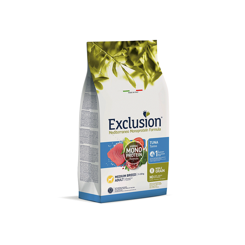 Exclusion Mediterraneo Noble grain Adult Tuna Medium breed – visavertis šunų maistas su tunu.