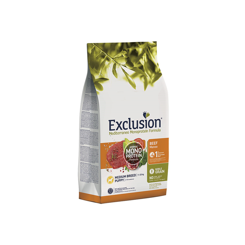 Exclusion sausas maistas šuniukams su jautiena. Subalansuotas jauniems, vidutinio dydžio veislių šuniukams ir papildytas išskirtiniais Viduržemio jūros regiono supermaisto ingredientais.