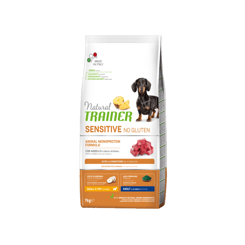Natural Trainer Sensitive sausas šunų maistas be glitimo. Vieno baltymo pašaras su ėriena, pritaikytas mažų veislių šunims.