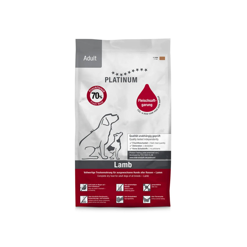 Platinum šunų maistas iš šviežios ėrienos. Pagaminta pagal FSG šviežios mėsos paruošimo metodą, dėl kurio mėsa išsaugo savo sultingumą ir pašaras tampa lengvai virškinamu bei puikiai įsisavinamu.