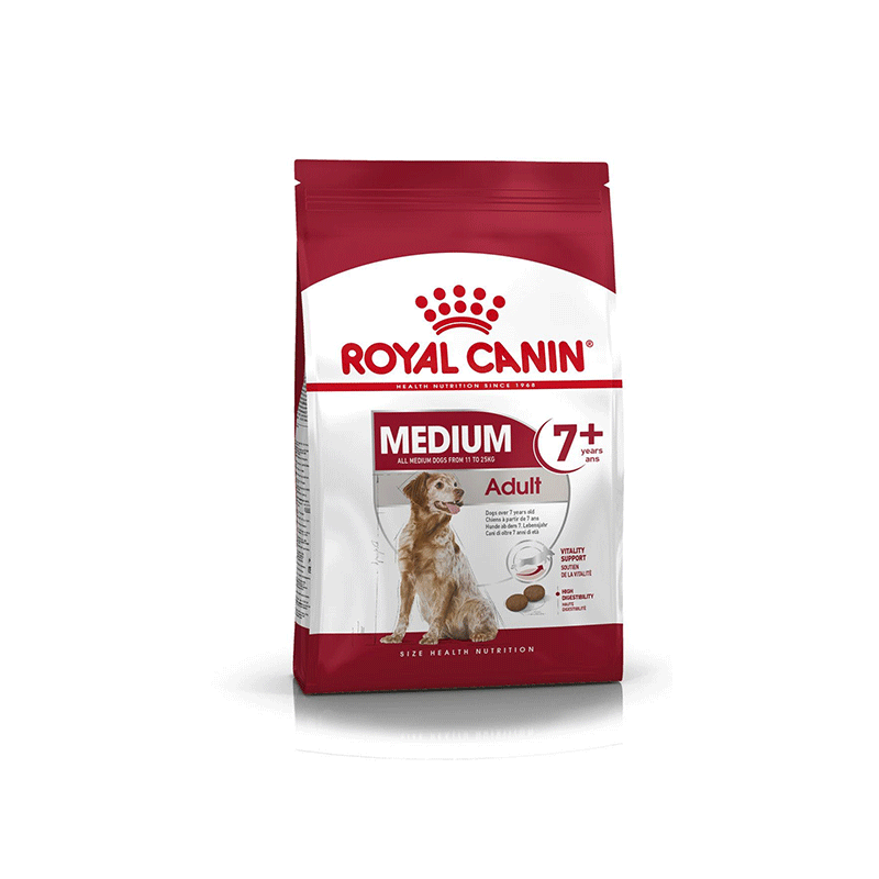 Royal Canin Medium Adult 7+ – sausas maistas vidutinio dydžio veislių, senyviems šunims, padedantis išlaikyti raumenų masę senstant ir suteikiantis energijos.