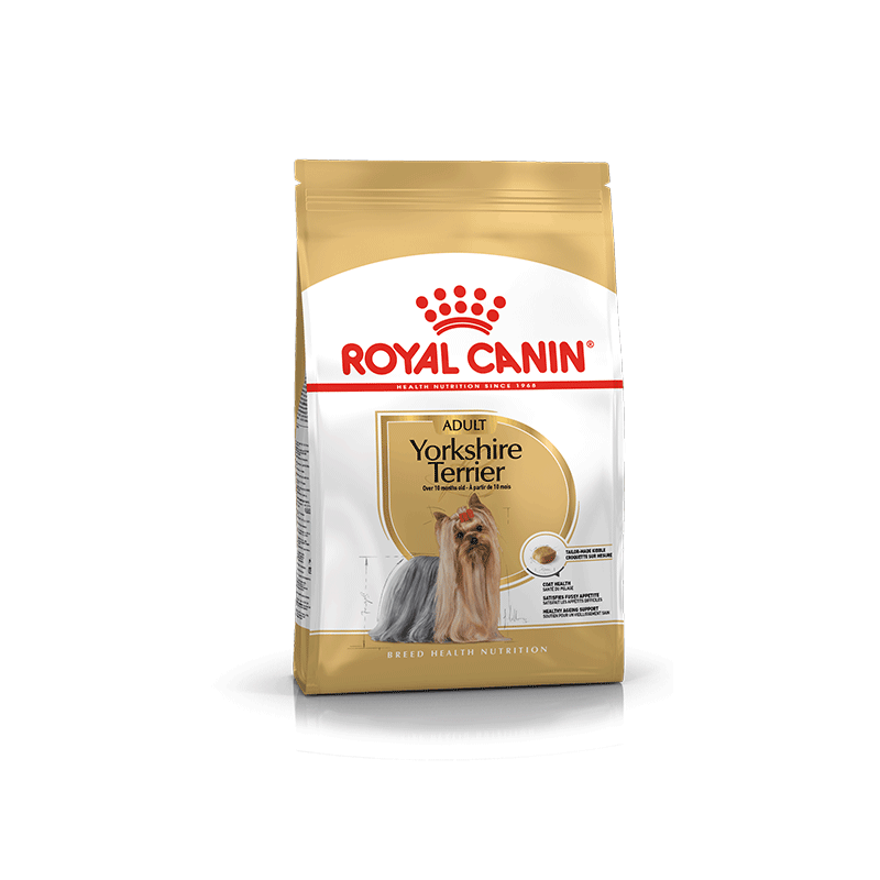 Royal Canin sausas maistas Jorkšyro veislės šunims, padedantis palaikyti sveiką kailio ir odos būklę.