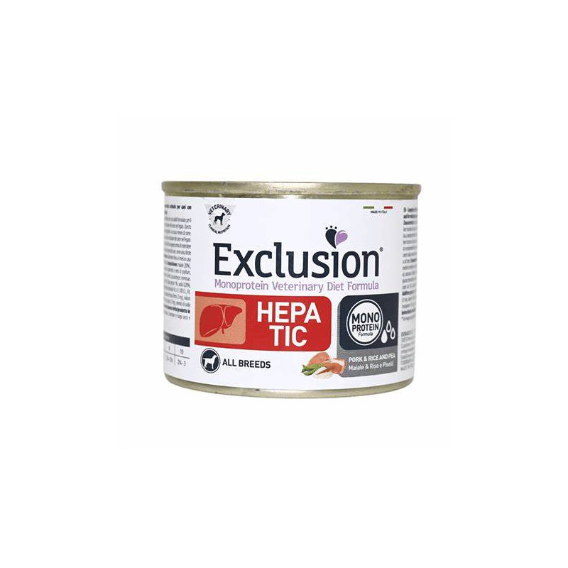 Exclusion Hepatic Pork & Rice – dietinis maistas šunims su kiauliena, ryžiais ir žirniais.