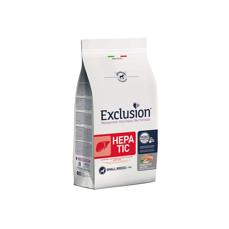 Exclusion Hepatic Pork, rice and pea Small breed – dietinis maistas šunims su kiauliena, ryžiais ir žirniais.