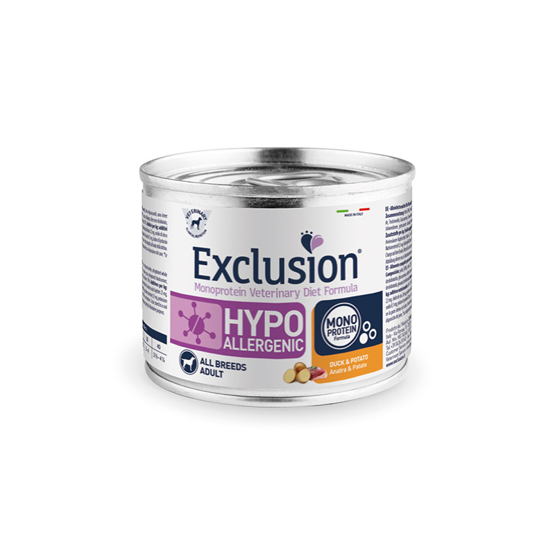 Exclusion Hypoallergenic Duck & Potato all breeds – šunų konservai su antiena ir bulvėmis, padedantys sumažinti maistinių medžiagų netoleravimo simptomus.
