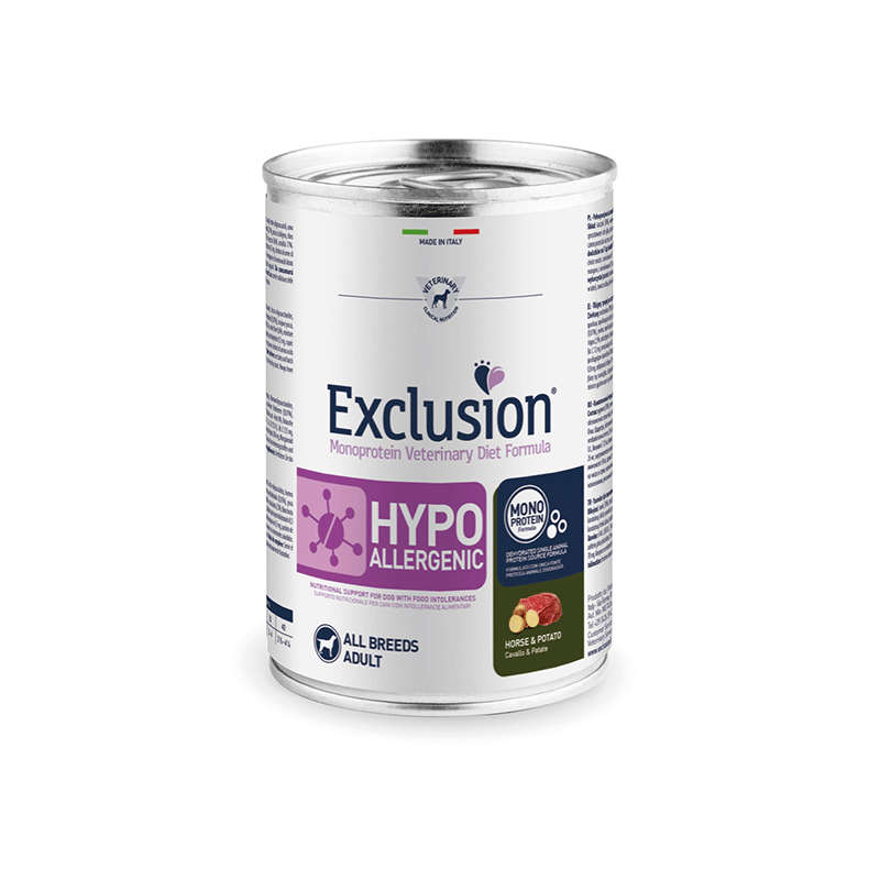 Exclusion Hypoallergenic Horse & Potato all breeds – konservai šunims su arkliena ir bulvėmis, padedantys sumažinti maistinių medžiagų netoleravimo simptomus.