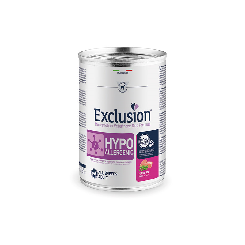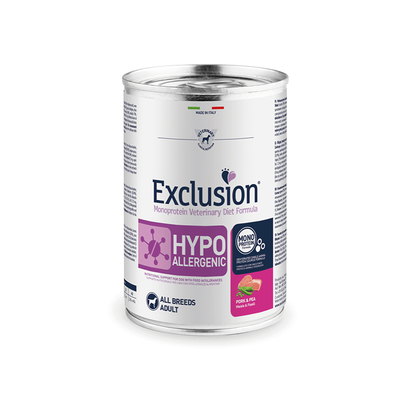 Exclusion hipoalerginis, šlapias maistas šunims su kiauliena ir žirniais. Subalansuotas suaugusiems, visų veislių šunims, kuriems pasireiškė alergijos maistui simptomai.