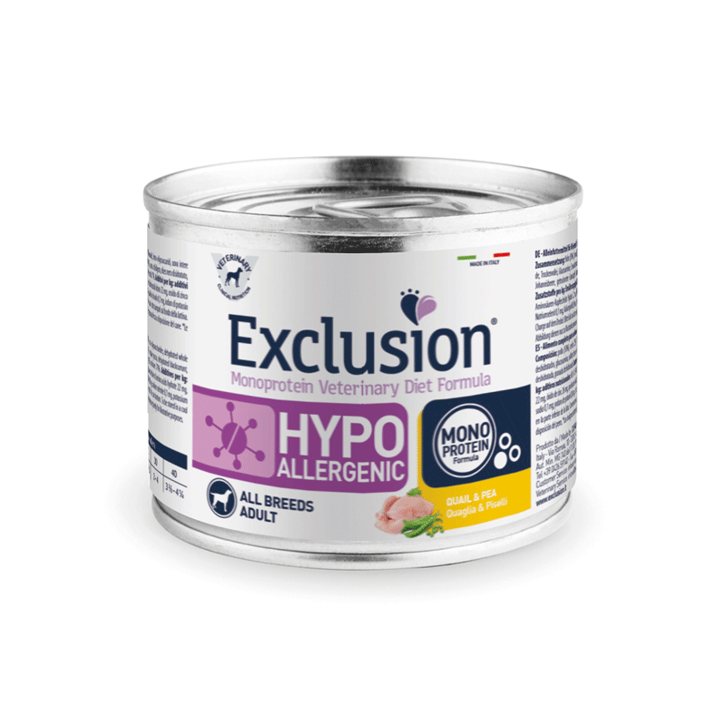 Exclusion hipoalerginis šlapias maistas šunims su putpelių mėsa ir žirniais. Subalansuotas suaugusiems šunims, kuriems pasireiškė alergijos maistui simptomai.