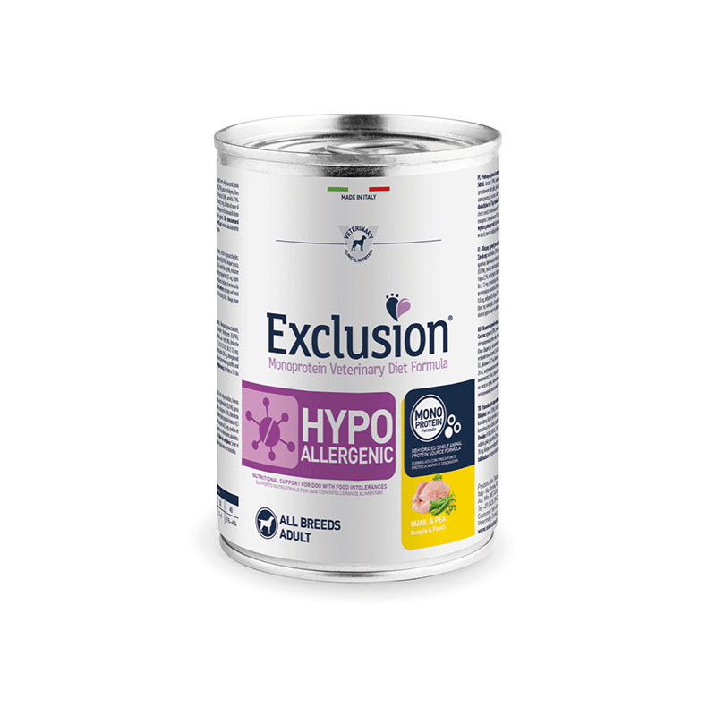 Exclusion hipoalerginis šlapias maistas šunims su putpelių mėsa ir žirniais. Subalansuotas suaugusiems šunims, kuriems pasireiškė alergijos maistui simptomai.
