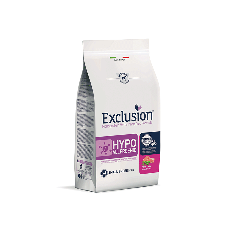 Exclusion hipoalerginis maistas šunims su kiauliena ir žirniais. Subalansuotas suaugusiems, mažų veislių šunims, kuriems pasireiškė alergijos maistui simptomai.