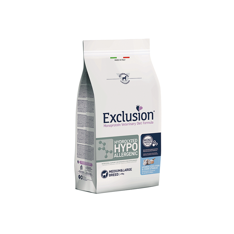 Exclusion Diet Hydrolyzed Hypoallergenic Fish & Corn starch medium / large breed – dietinis šunų maistas su žuvimi ir kukurūzų krakmolu, padedantis sumažinti maistinių medžiagų netoleravimą.