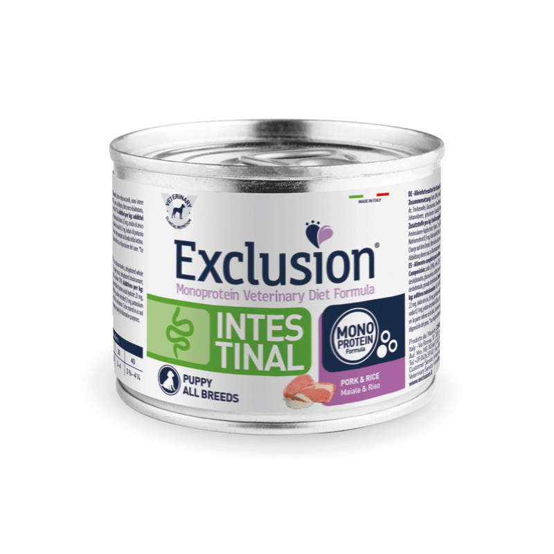 Exclusion Intestinal Pork & Rice puppy – dietinis, šlapias maistas šunims, kenčiantiems nuo virškinamojo trakto sutrikimų.