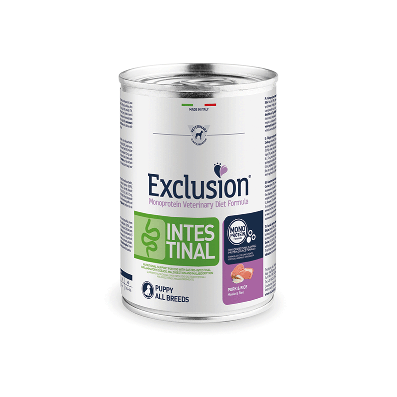Exclusion Intestinal Pork & Rice puppy – dietinis maistas šunims, kenčiantiems nuo virškinamojo trakto sutrikimų.