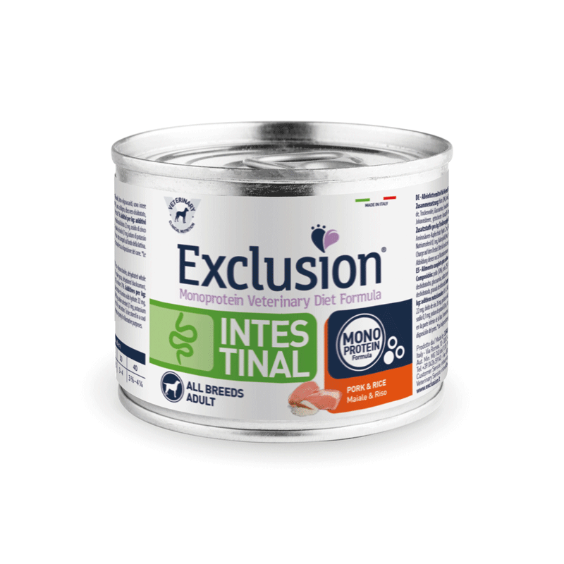 Exclusion Intestinal Pork & Rice all breeds – dietinis maistas šunims, kenčiantiems nuo virškinamojo trakto sutrikimų.