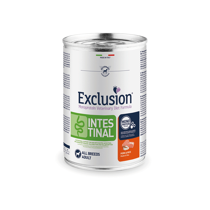 Exclusion konservai šunims su kiauliena ir ryžiais, skirti virškinamojo trakto ligoms gydyti. Lengvai virškinami ir tinkami visų veislių, suaugusiems šunims.