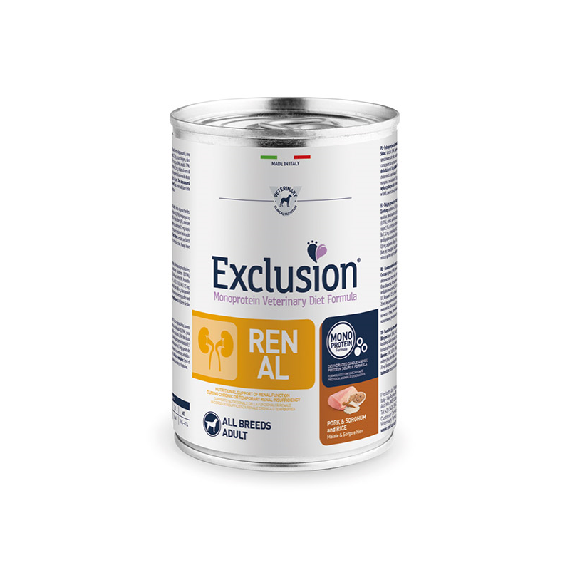 Exclusion Renal Diet – konservai šunims su kiauliena, sorgais ir ryžiais.