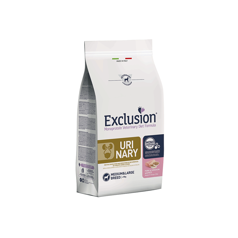 Exclusion šunų maistas, skatinantis šlapimo rūgštingumą ir struvitinių akmenų tirpimą. Gardus ir maistingas pašaras šunims, padedantis gydyti šunų akmenligę ir sumažinti naujų akmenų susidarymo tikimybę.