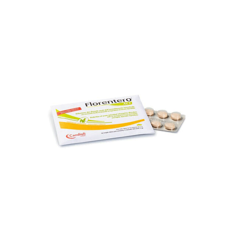 Candioli Florentero ACT tabletės šunims ir katėms, palengvinančios ūmius žarnyno sutrikimus ir stabdančios viduriavimą.