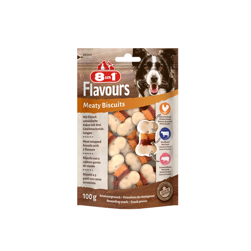 8in1 Flavours Meaty Biscuits – šunų skanėstai su gardžia kiauliena, apvyniota vištienos krūtinėlės ir jautienos mėsa.
