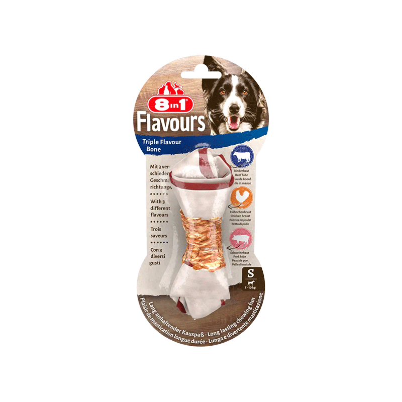 8in1 Flavours Triple Flavour Bone S – kramtomas skanėstas mažų veislių šunims su jautienos ir kiaulienos oda, apvyniota vištienos krūtinėle.