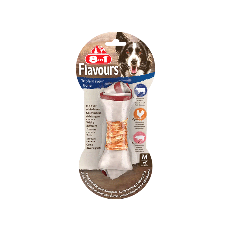 8in1 Flavours Triple Flavour Bone M – kramtomas skanėstas vidutinio dydžio veislių šunims su jautienos ir kiaulienos oda, apvyniota vištienos krūtinėle.