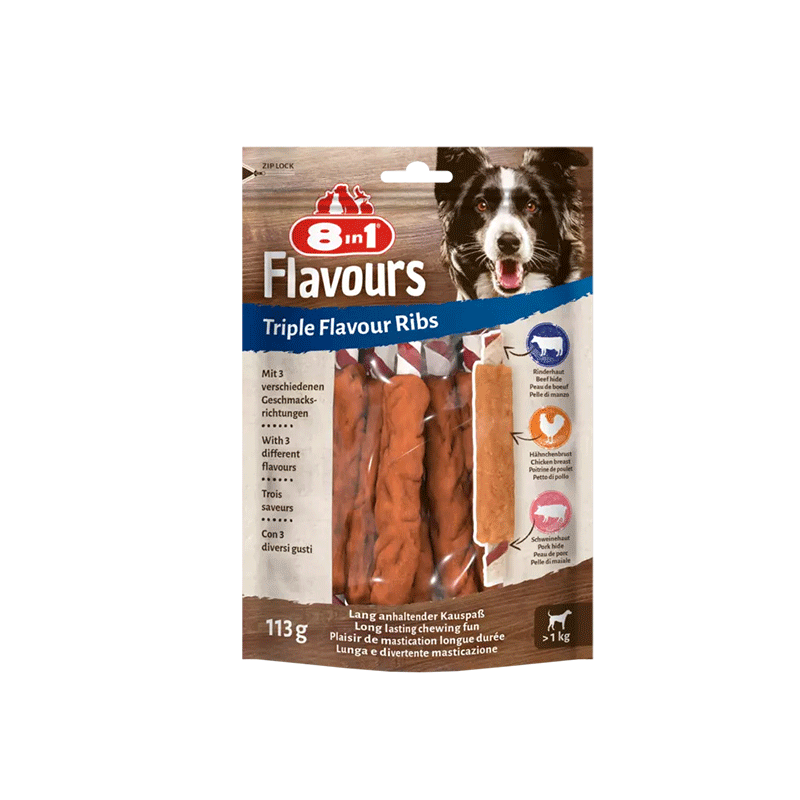 8in1 Flavours Triple Flavour Ribs – kramtomi šonkauliukai šunims su jautienos ir kiaulienos oda, apvyniota vištienos krūtinėle.