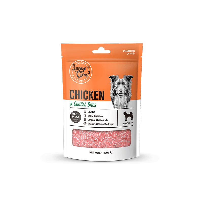 Jerky Time ypatingai gardūs vištienos ir menkės skanėstai šunims, pagaminti iš šviežios mėsos. Gausūs vertingų vitaminų, mineralų ir omega-3 riebalų rūgščių, padedančių palaikyti sveiką odą ir kailį.