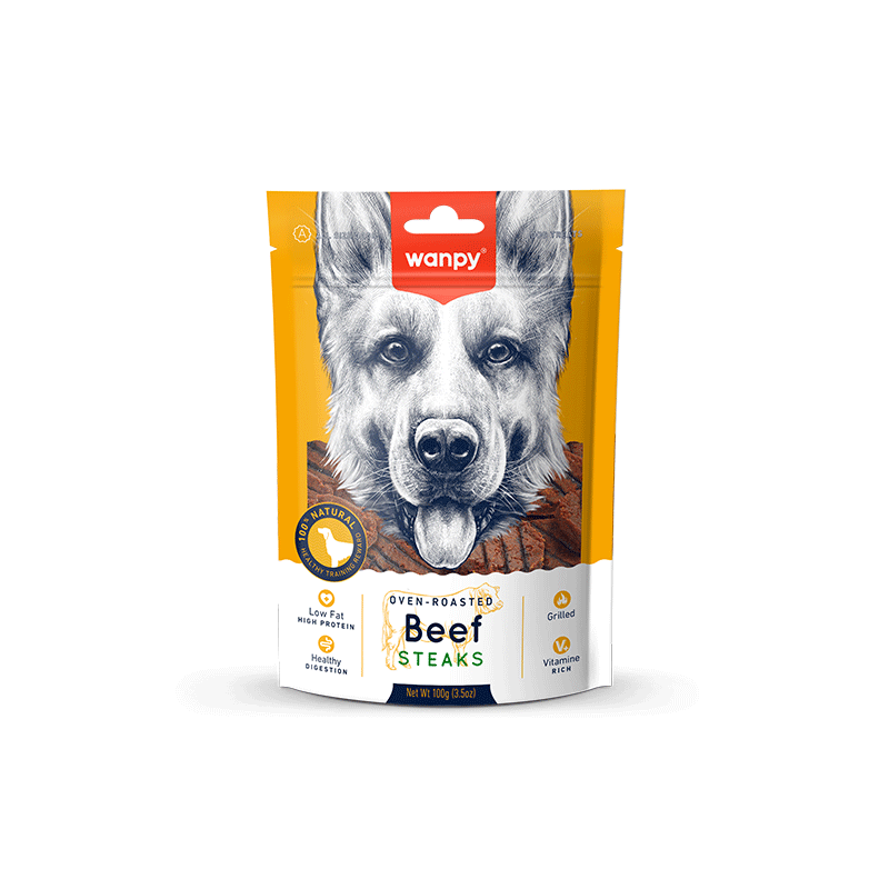 Wanpy keptų jautienos kepsnelių skanėstai šunims, gausūs įvairių vitaminų. Skanus, sveikas ir 100 % natūralus užkandis Jūsų augintiniui!