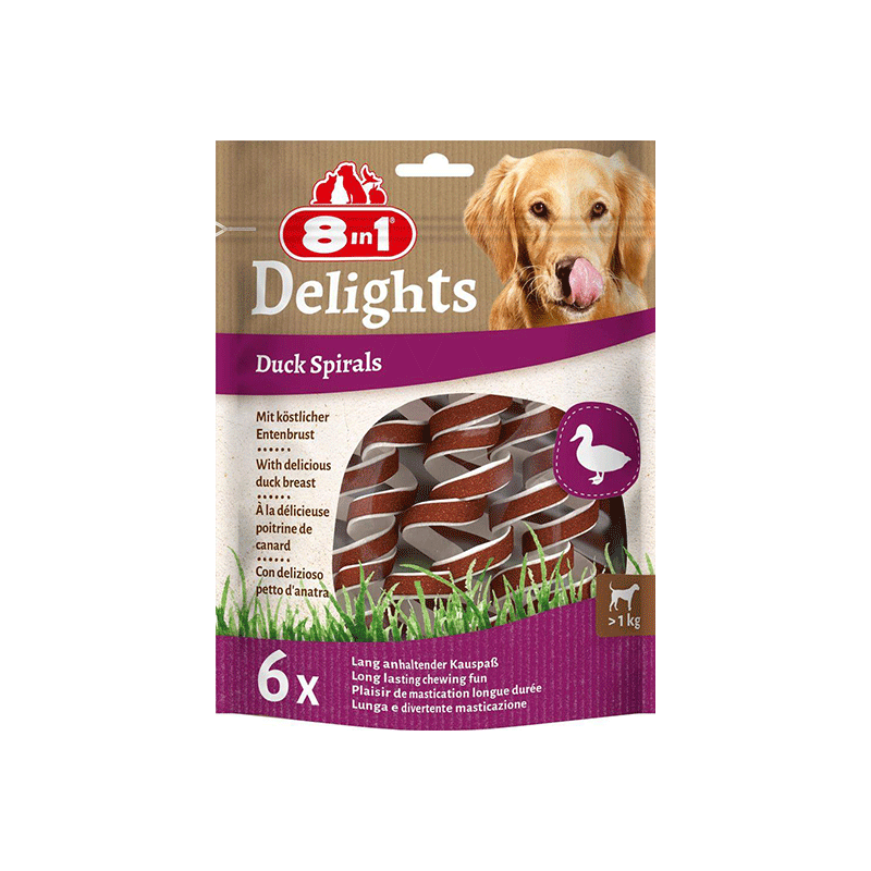 8in1 Delights Duck Spirals – šunų skanėstai su gardžia antiena, padedantys pasirūpinti tinkama augintinio dantų higiena.
