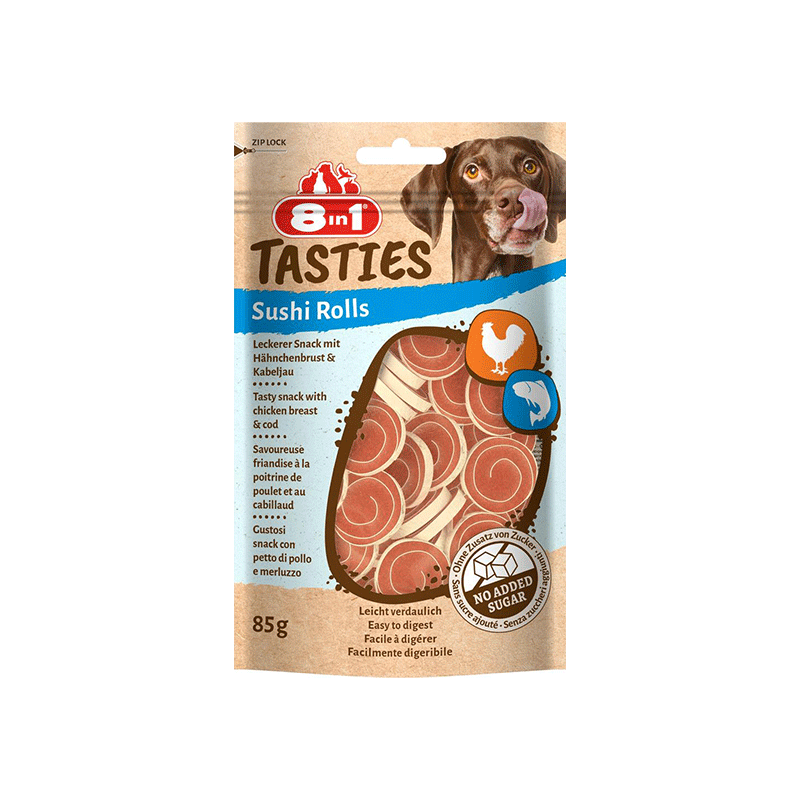 8in1 Tasties Sushi Rolls – sušio formos šunų skanėstai su gardžia vištienos krūtinėle, apvyniota menkės mėsa.